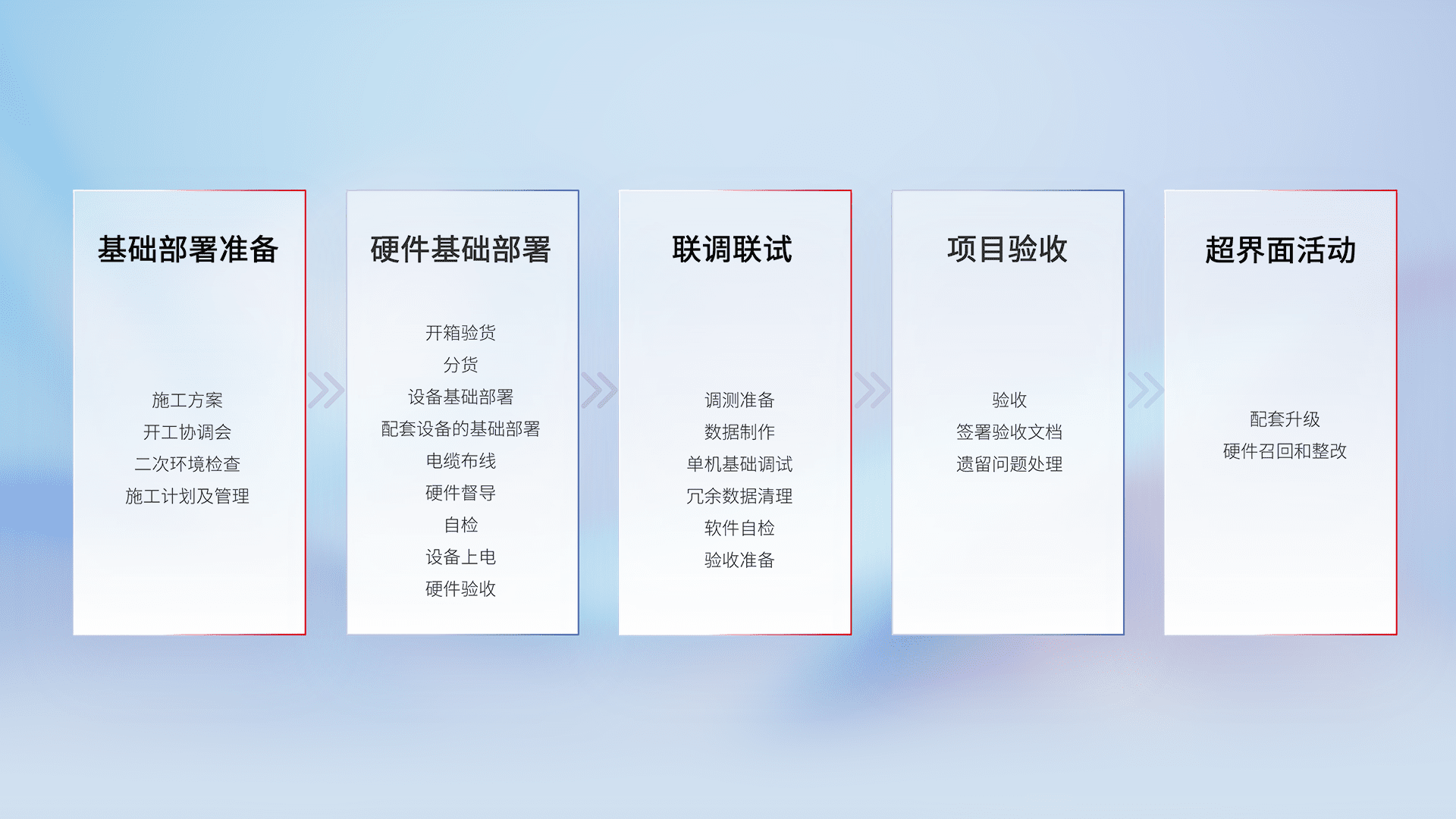 从基础部署准备、、、硬件基础部署、、联调联试、、、、项目验收、、越界面活动的全过程可追溯,,保证施工质量和进度。。。